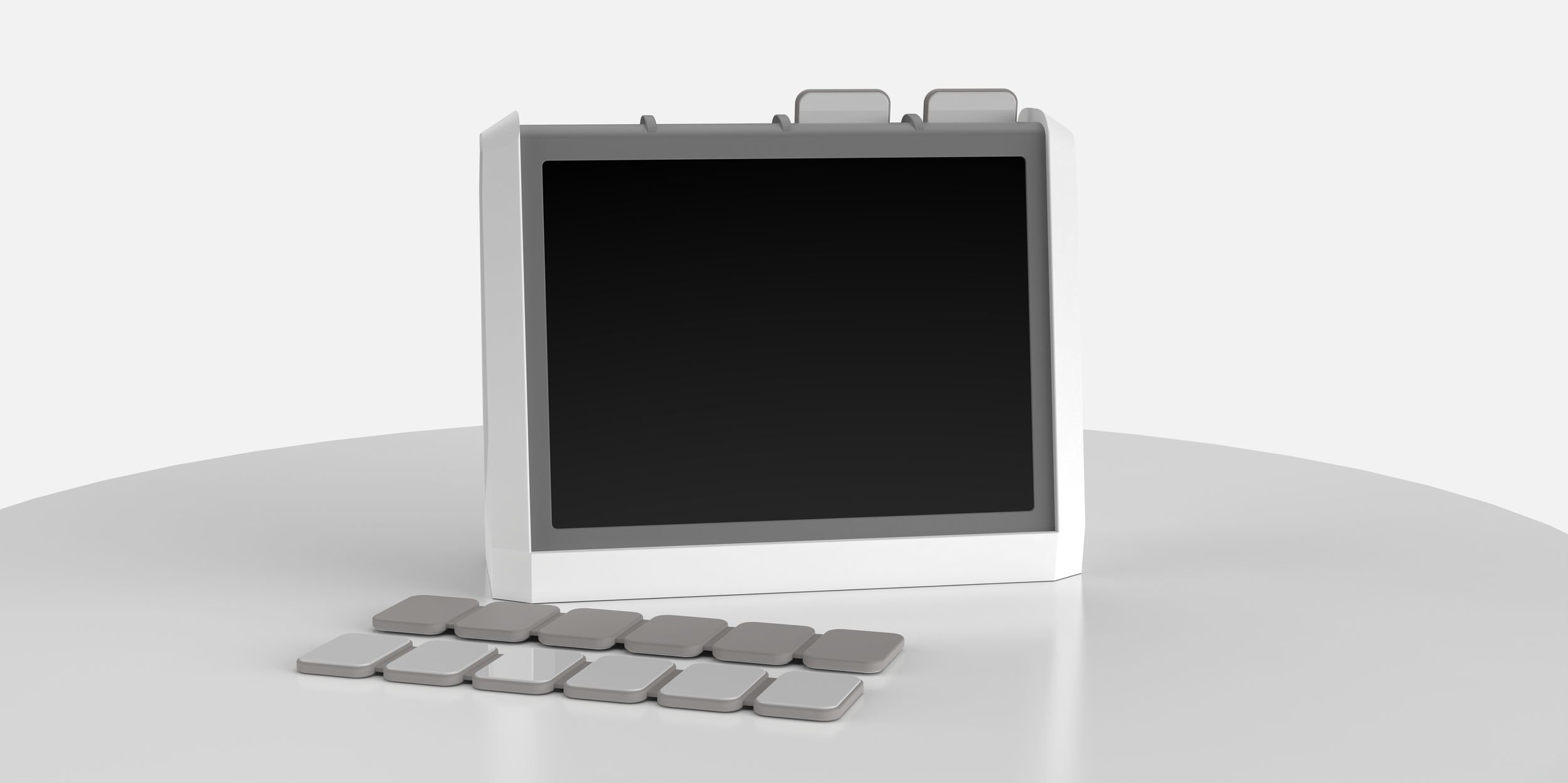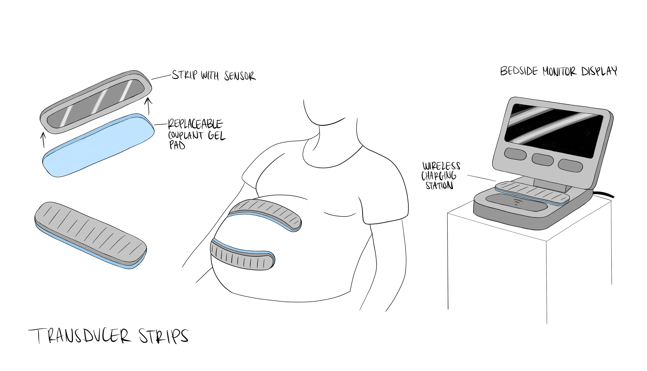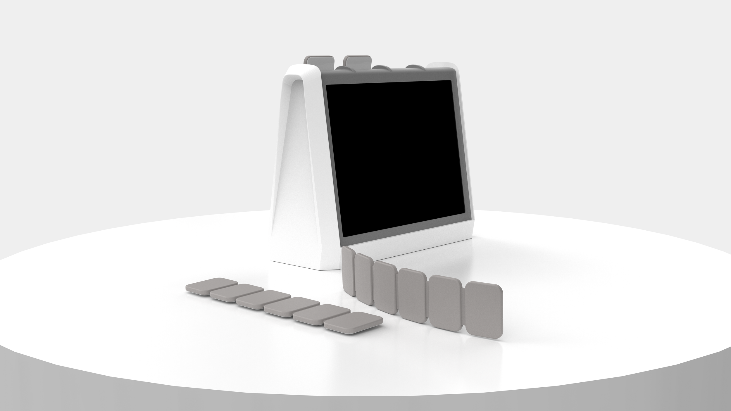 NeoTrak is fetal monitoring reimaged. It consists of a monitor display and four body conforming sensor strips that track fetal heart rate and uterine contractions throughout labor. When not in use, the sensor strips nest neatly into the back of the monitor display, where they recharge wirelessly. The monitor displays the fetal heart race trace and toco trace, as well as the battery life of the strips. The display presents real-time fetal heart rate and toco traces, along with the battery status of each strip, creating a more seamless and intuitive monitoring experience.